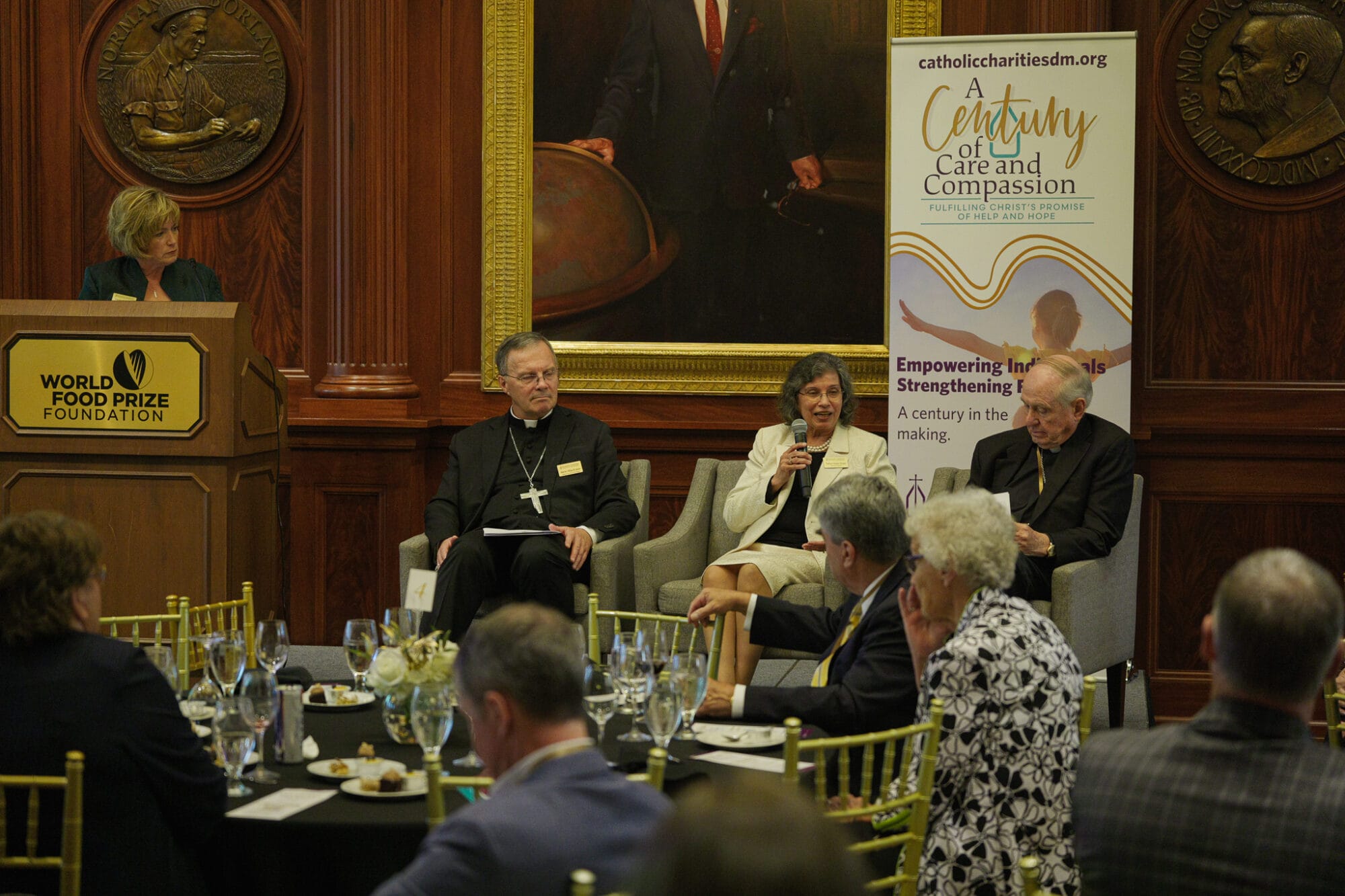 To recognize this momentous year, Catholic Charities celebrated with board members, community partners, top donors, volunteers and staff on Thursday, September 5, 2024, at the World Food Prize Hall of Laureates in downtown Des Moines. The event featured a panel discussion on Catholic Charities’ profound impact over the years from Bishop Joensen, Bishop Emeritus Richard E. Pates, former Bishop of the Diocese of Des Moines, and Barbara Decker. Bishop Joensen also provided a vision for the future in fostering the ministry and mission of Catholic Charities.